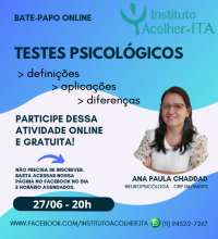 BATE-PAPO COM ANA PAULA DE OLIVEIRA CHADDAD. Tema: Testes Psicológicos Plataforma Facebook, 27/06, às 20h.